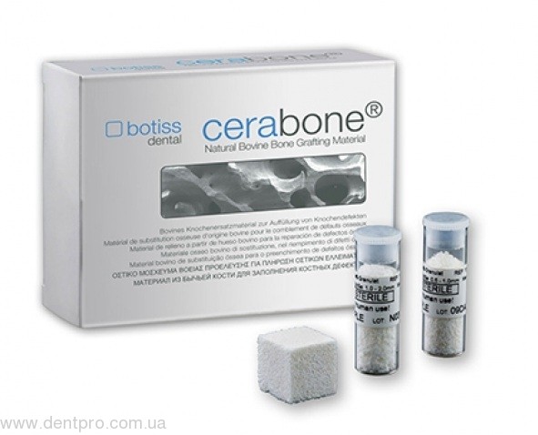 Cerabon Botiss dental является ведущим немецким костнозамещающим препаратом, изготовленным из натуральной кости, чей успех был подтвержден многочисленными клиническими исследованиями. Уникальный процесс производства с высокотемпературным нагреванием удаляет все органические компоненты и предотвращает потенциальные иммунные реакции. Сerabone® является на 100% безопасным в отношении спонгиформной энцефалопатии и не содержит белка, что подтверждают исследования Министерства здравоохранения Германии. Сerabone® является ведущим немецким трансплантационным материалом, изготовленным из бычьей кости, чей успех был подтвержден многочисленными клиническими исследованиями.
