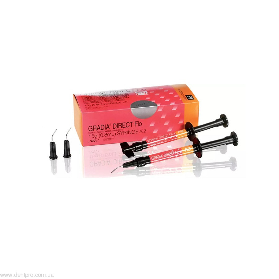 GRADIA DIRECT FLO (Градия Директ Фло) - универсальный светоотверждаемый микрофильный гибридный композит с отличной текучестью. Благодаря специальной дозировочной насадке, Gradia Direct Flo можно легко выдавливать, что позволяет улучшить эстетичность реставрации.